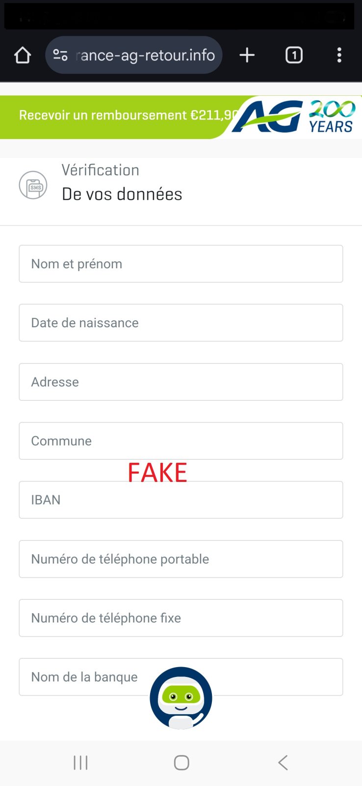 - Der in der SMS enthaltene Link entspricht nicht der offiziellen URL von AG Insurance. Dieser Link führt zu einer gefälschten Website im Design des Unternehmens.