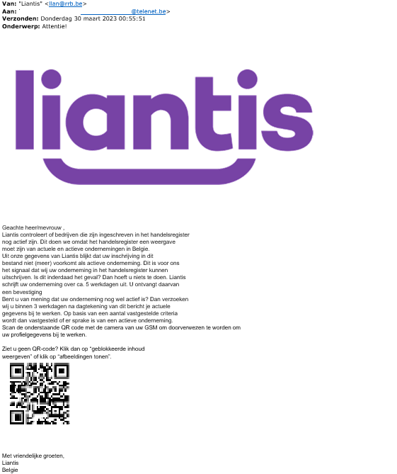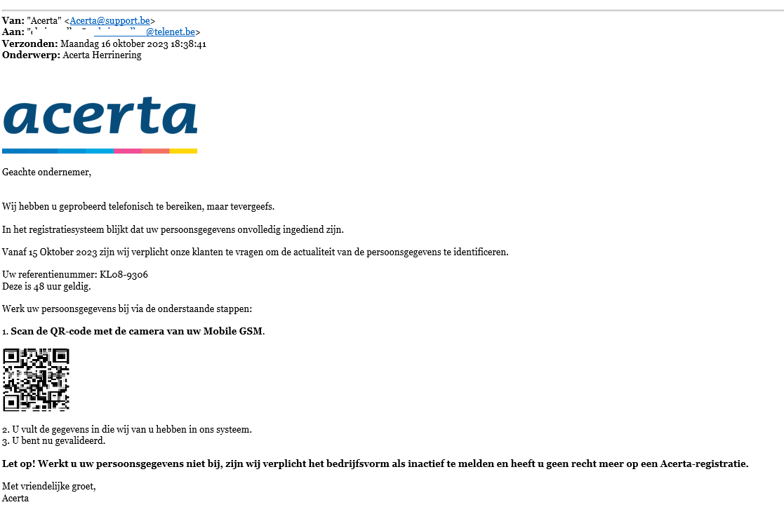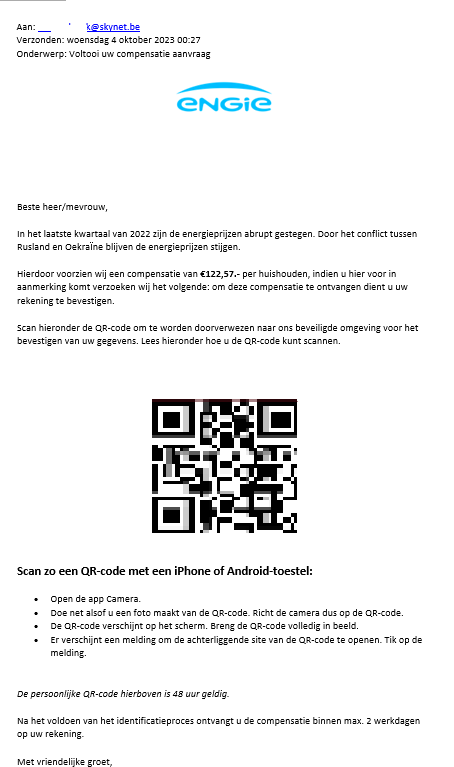 Hieronder geven we een paar concrete gevallen die zijn ontvangen via verdacht@safeonweb.be. Meestal voegen criminelen een kwaadaardige QR-code in in een bericht dat legitiem lijkt en leiden ze slachtoffers naar phishingsites waar hun persoonlijke gegevens kunnen worden gestolen.